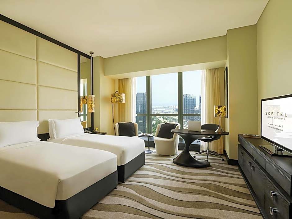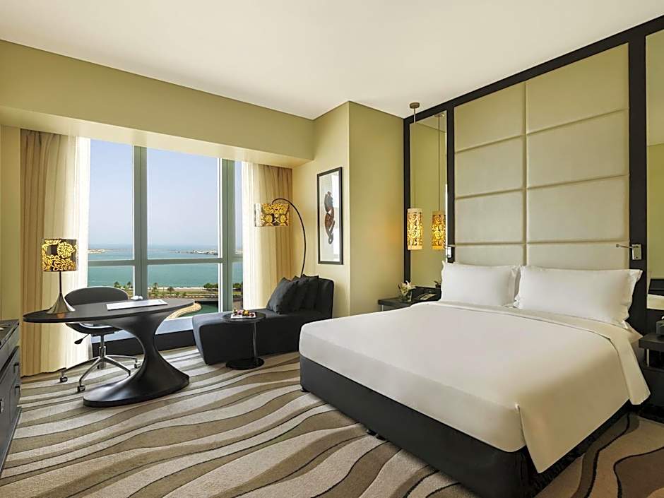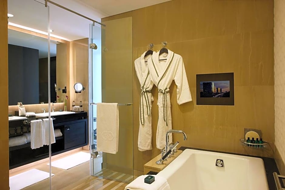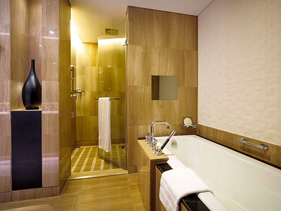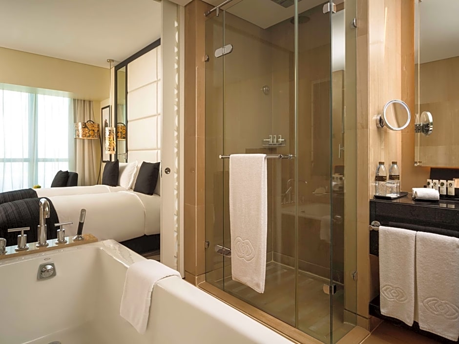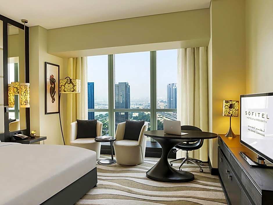 This luxurious room features views over the Corniche and the city. It offers an executive lounge access (currently relocated). It includes a 55-inch flat-screen TV and sound system. The room comes with a laptop-size safe and a mini-bar. The partially open bathroom has a bathtub, a rainfall shower, and a bidet. It also has a hairdryer, designer toiletries, bathrobes, and slippers. No extra beds are available for this room type.