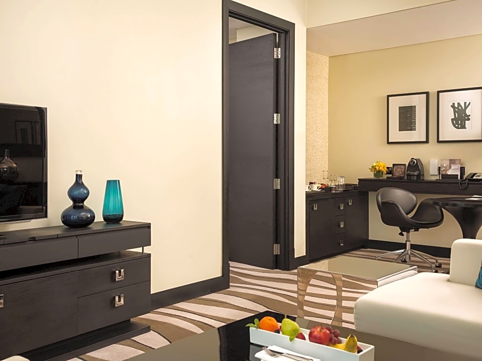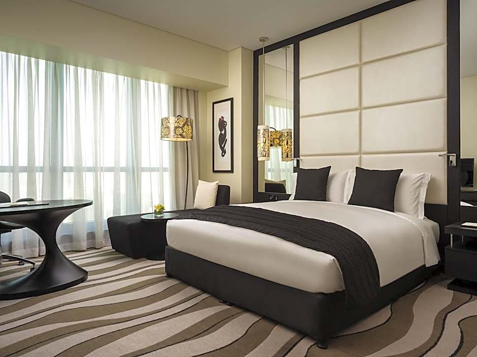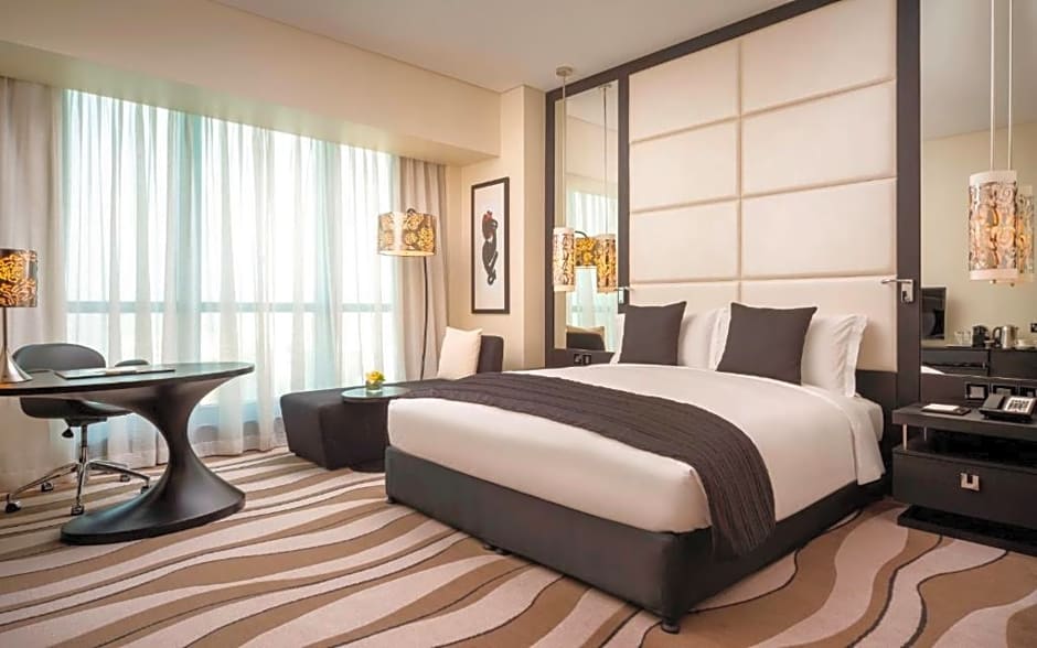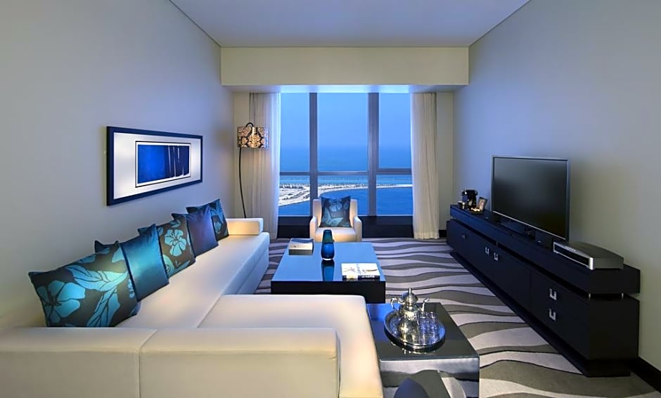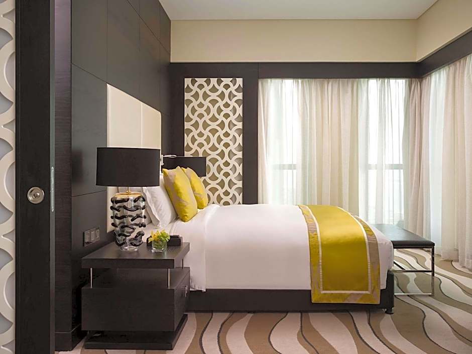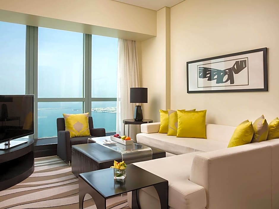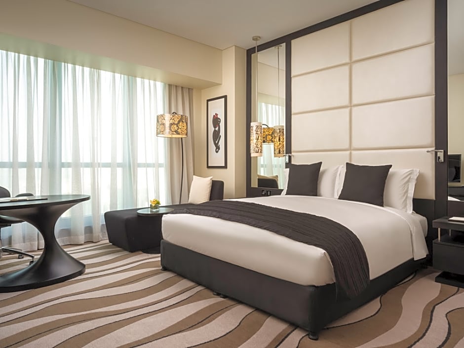 This luxurious room features views over the Corniche and the city. It offers an executive lounge access (currently relocated). It includes a 55-inch flat-screen TV and sound system. The room comes with a laptop-size safe and a mini-bar. The partially open bathroom has a bathtub, a rainfall shower, and a bidet. It also has a hairdryer, designer toiletries, bathrobes, and slippers. No extra beds are available for this room type.